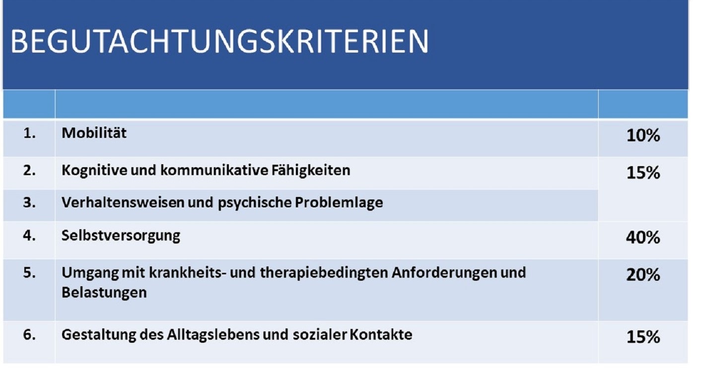 Maßgeblich für das Vorliegen von Pflegebedürftigkeit sind Beeinträchtigungen der Selbständigkeit oder Fähigkeitsstörungen in den sechs Bereichen, die sich auf die in den Bereichen angegebenen Aktivitäten und Fähigkeiten beziehen.